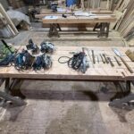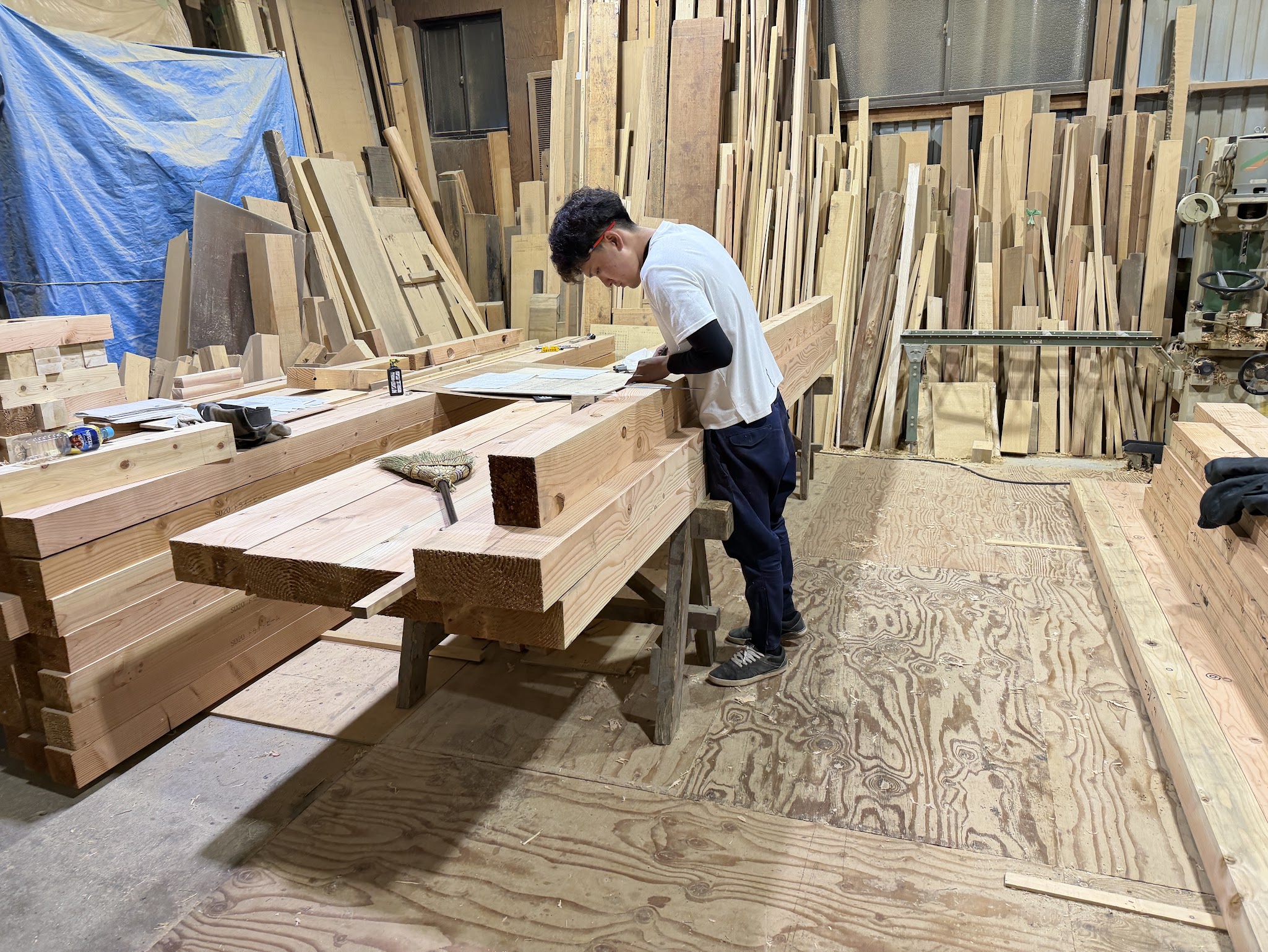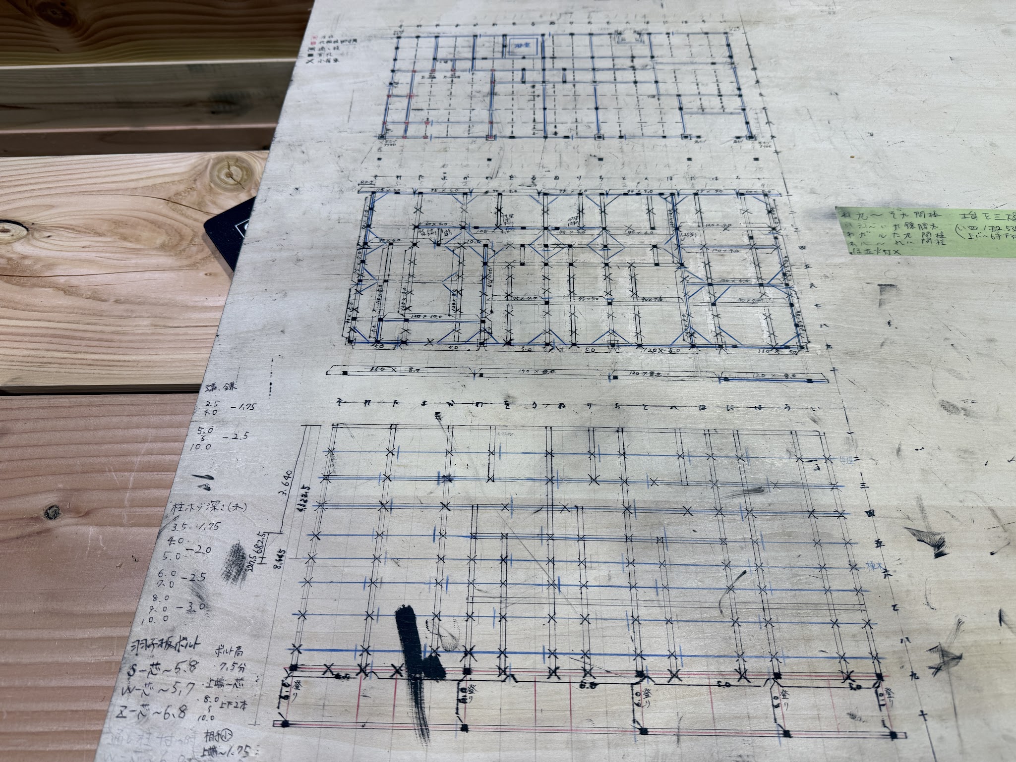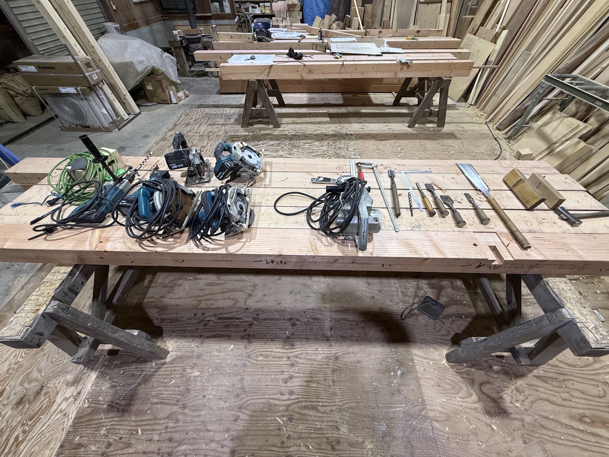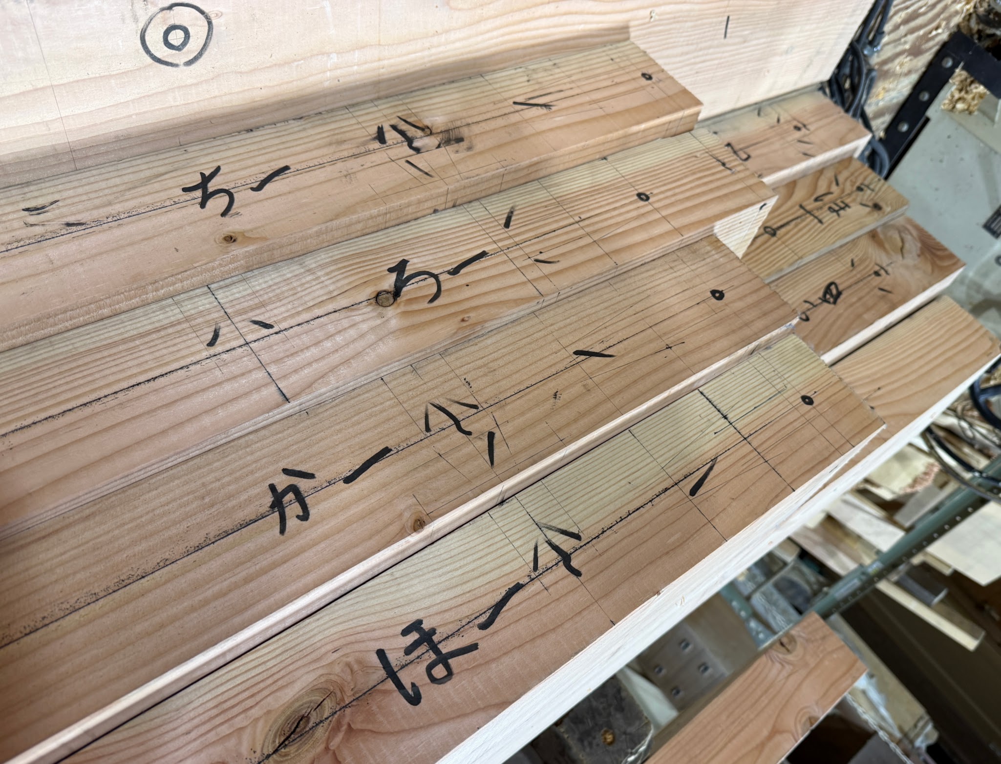 墨付け中です 2026.04.10 家づくり 都内新築現場の棟上げに向けて、髙木大工が墨付け中! 「ち一」など、一つ一つの材木に墨で番付を書いていきます。 墨で書かれた板図をもとに墨付けを行います。 真剣に作業を行う髙木大工・・・ 大工さんが帰った後は、道具が綺麗に整頓されていました。